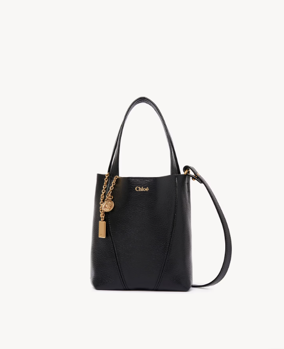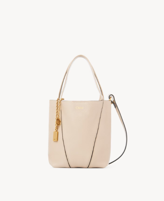 Crafted from shiny grained cowhide, the small Chloé Spin tote bag has a minimalist silhouette elevated with graphic lines. A dangling chain features the Maison's signature Chloé and Horse Medals.
